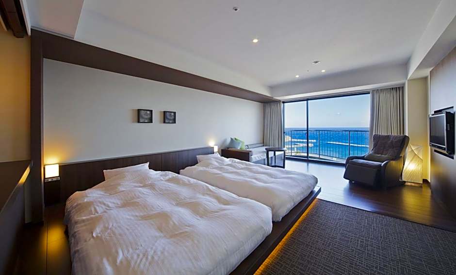 The quadruple room provides air conditioning, tatami, a balcony with sea views as well as a shared bathroom featuring a shower. The unit offers 4 beds.